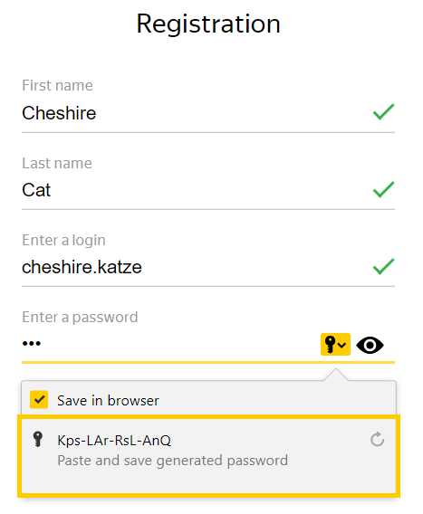 1. Place the cursor in the password field. Yandex Browser will automatically generate a password for you.