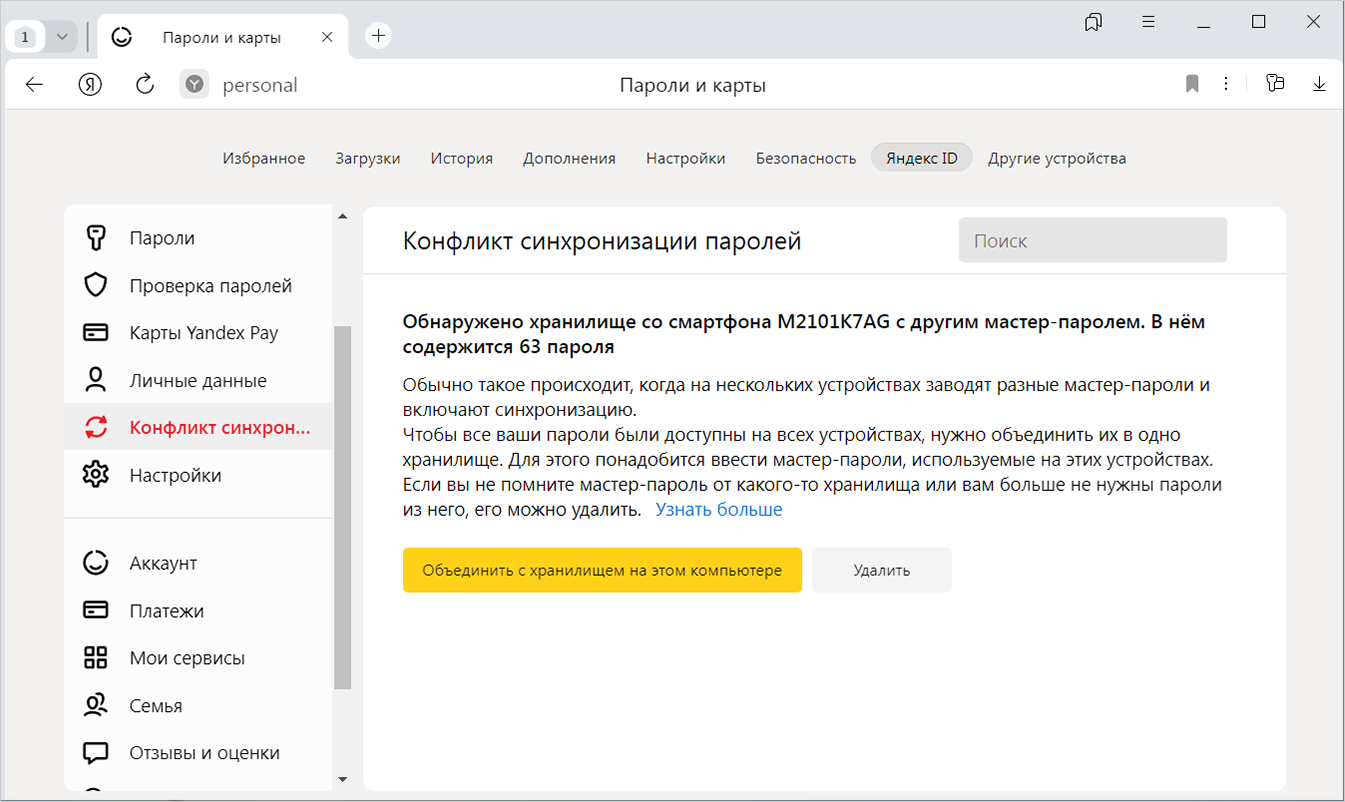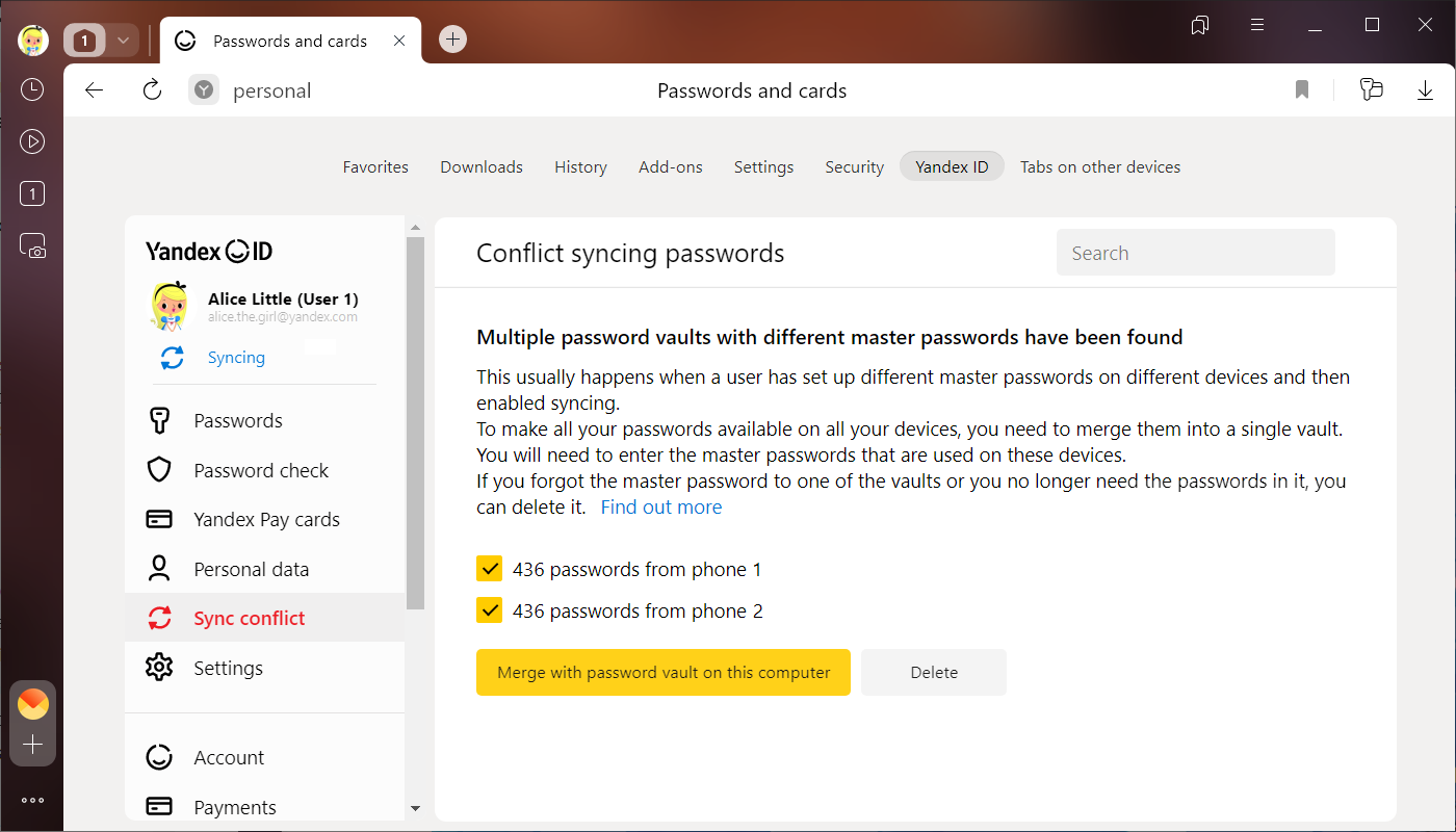 If you change your master password on one of the synced devices, after synchronization, the password will change on other devices as well. If you change the master password on a device that is not synced, or create different master passwords on devices before they are synced, there will be a conflict. For example, you had entered one master password on your smartphone and another on your computer, and then enabled syncing. In this case, Yandex Browser doesn't know which master password it should use to encrypt the combined vault.