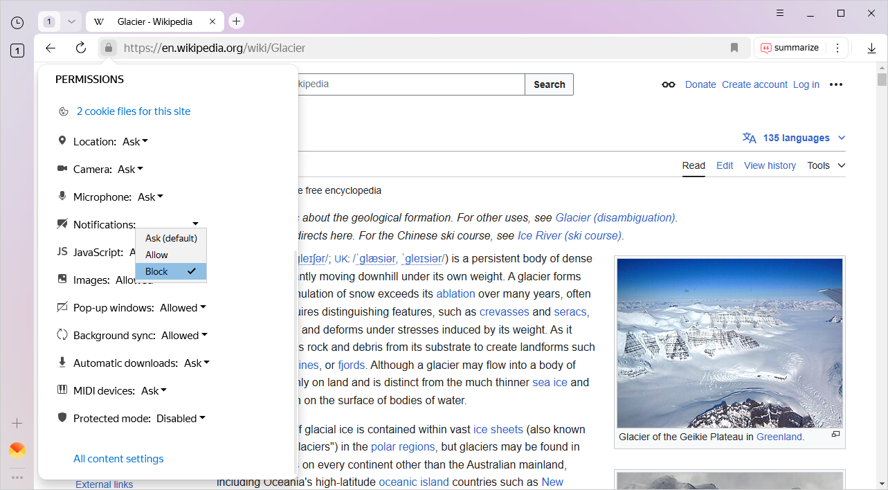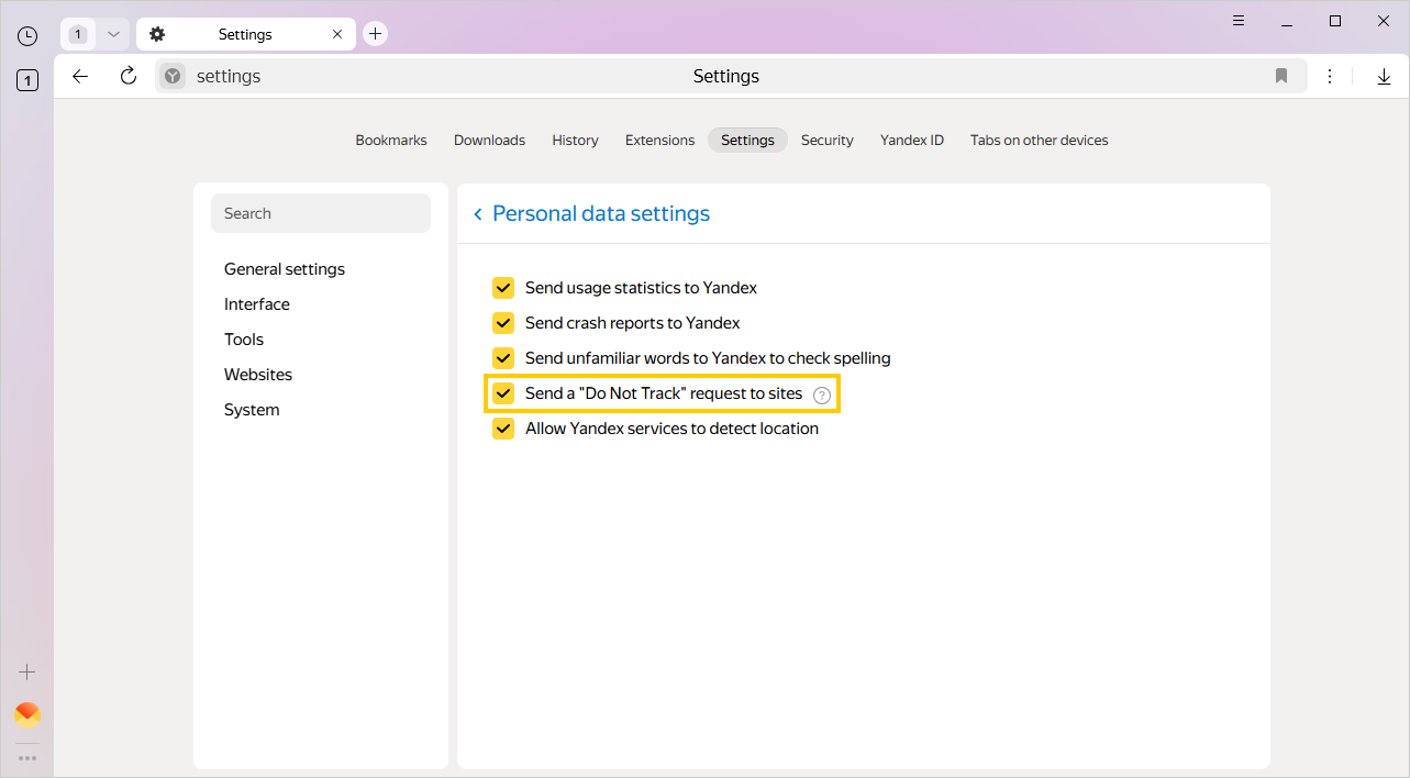 To provide safe and convenient browsing experience, the Yandex Browser beta version applies various processing rules to site elements. It blocks pop-ups, warns you when a website requests your location, and so on. To change Yandex Browser behavior for all sites or the selected one, go to settings or use the Protect panel. For example, you can choose to block JavaScript on all sites or allow a site to access your camera.