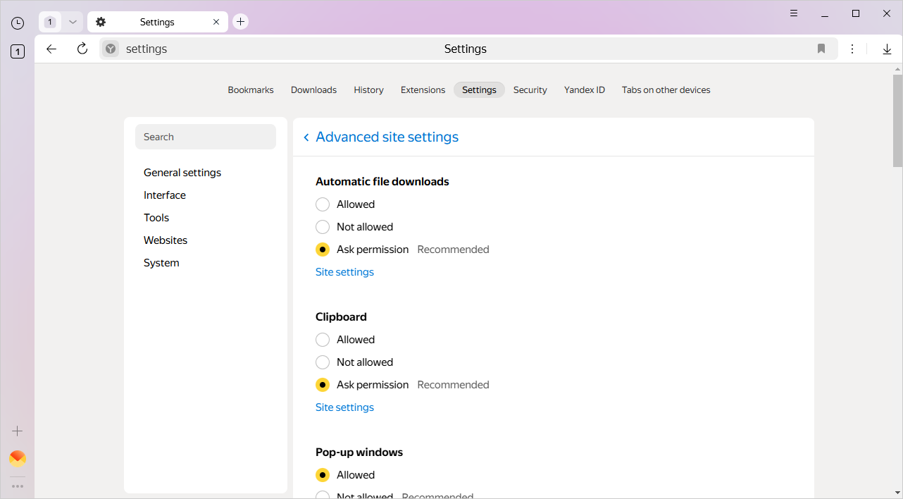 If Yandex Browser rules interfere with how you use a website, you can set an exception for this site. For example, you can allow Yandex Maps to determine your location automatically, but have all other sites ask for your permission.