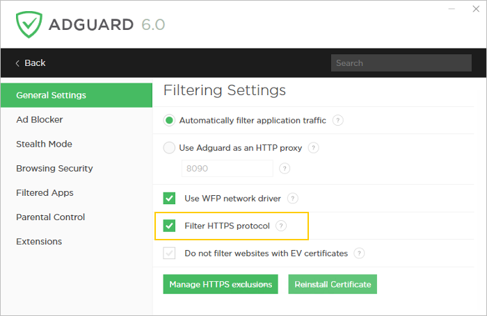 The path to the correct setting may be different depending on what version of the program you have. For the AdGuard extension, you don't need to disable anything because it doesn't create its own certificates.