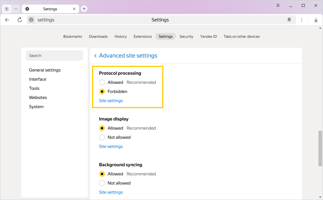 In the Protocol processing section, click Site settings.