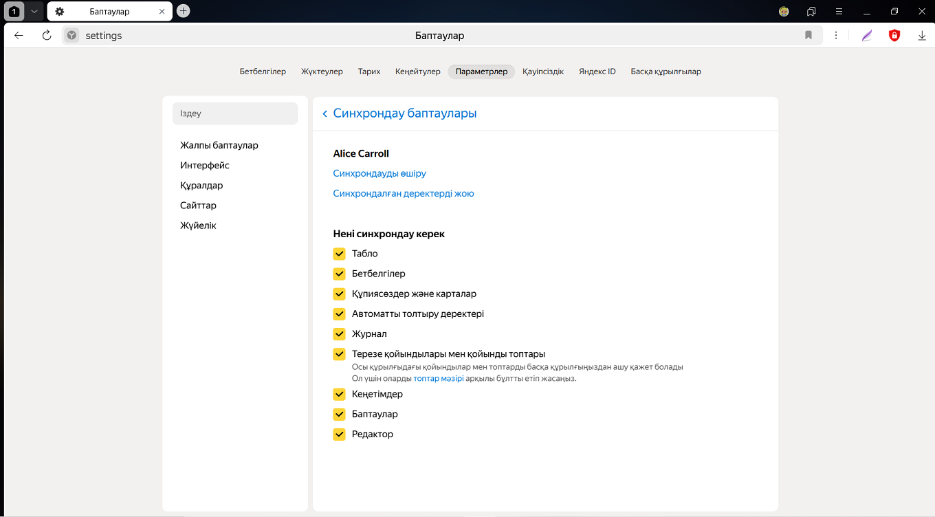 Егер Браузерде бірнеше профиль қолданылса, синхрондау алдында профильде болуыңыз керек (әйтпесе, сіз өз баптауларыңызды және деректеріңізді осы уақытта белсенді басқа профиль деректерімен араластырып алуыңыз мүмкін).