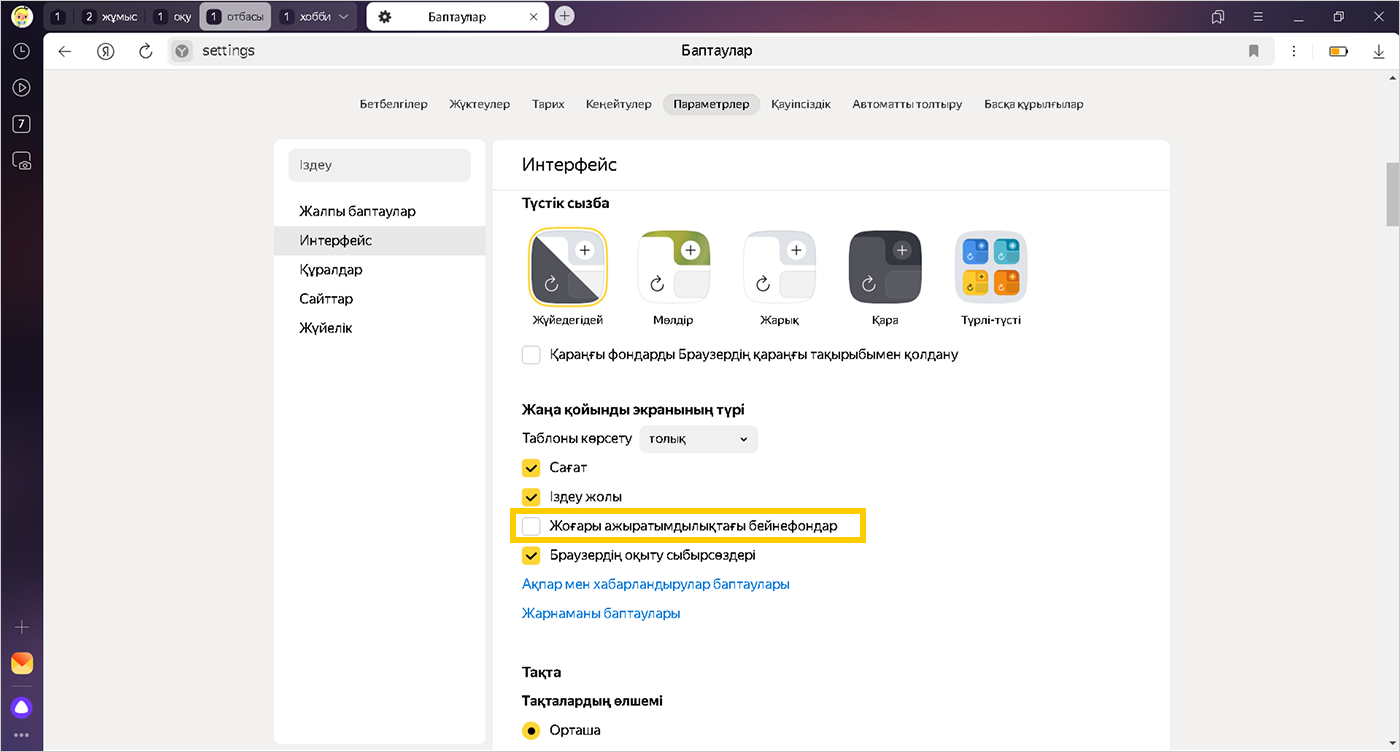 Анимация әдепкі бойынша жоғары тұнықтықта ойнатылады. Егер бұл Яндекс Браузердің бета-нұсқасы жұмысын баяулатса, стандартты анимация сапасын орнатыңыз: