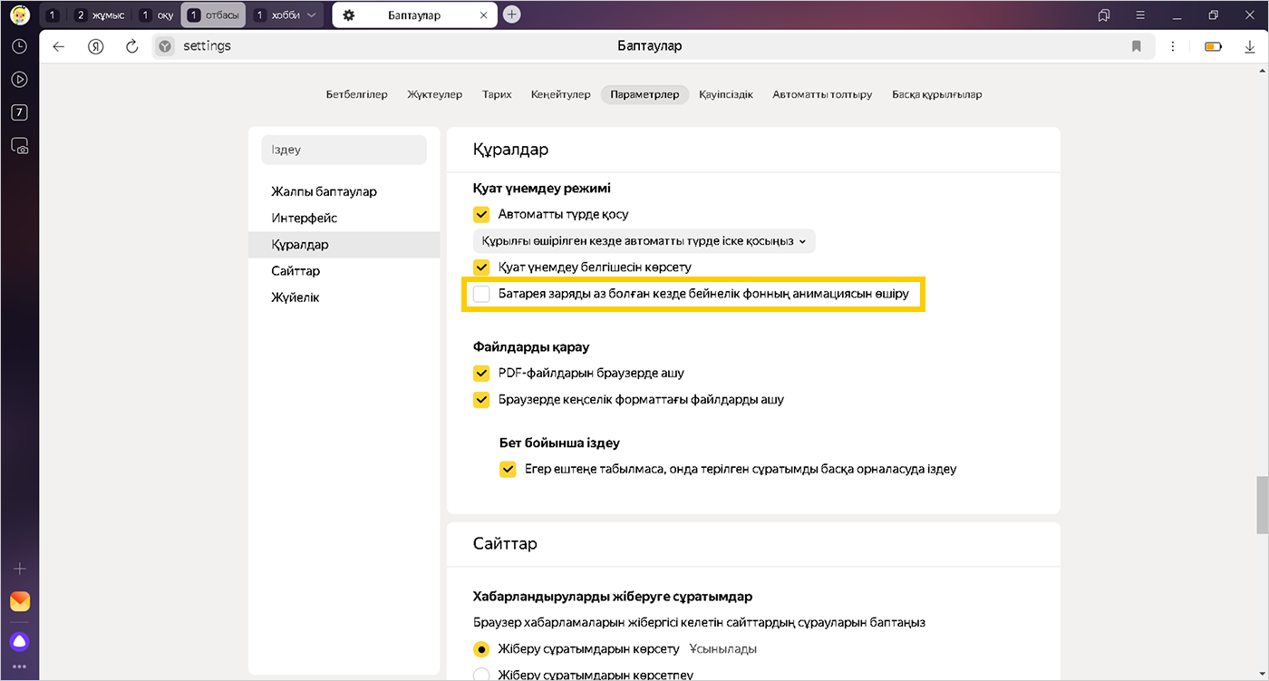 Қуат үнемдеу режимі бөлімінде Батарея заряды аз болған кезде бейнелік фонның анимациясын өшіру опциясын белсенді емес жасайды.
