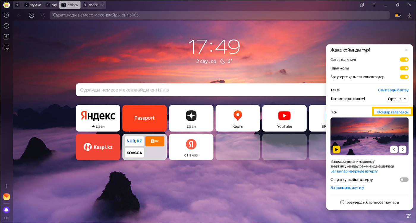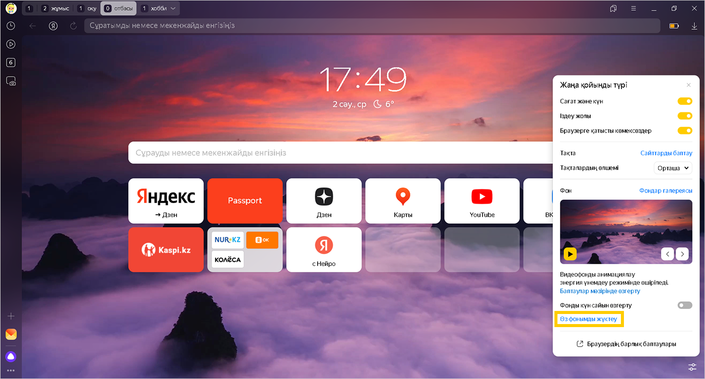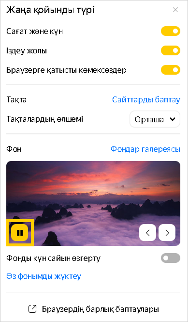 Жаңа қойындыдағы сілтемелердің мәтіндері мен батырмалардың атаулары оңай оқылуы үшін компьютерден жүктелген барлық фондарға қараңғылату фильтрі қолданылады. Бұл фильтрді алып тастау мүмкін емес. Егер сіз одан жарықтау фон алғыңыз келсе, бастапқы суреттің жарықтығын арттырыңыз.