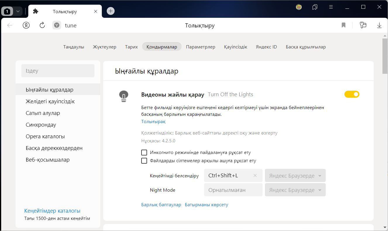 Тізімде алдын ала орнатылған кеңейтімдер (мысалы, Антишок) және Браузердің қосымша функциялары аталған (мысалы, синхрондау).