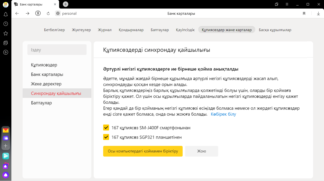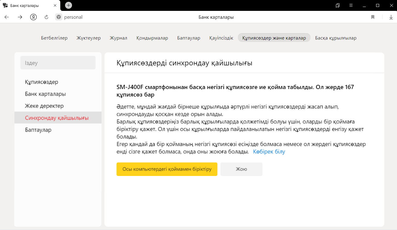 Басқа құрылғыдағы Яндекс Браузерде сақтаған құпиясөздерді компьютерге тасымалдауға болады (компьютер, смартфон немесе планшетте).