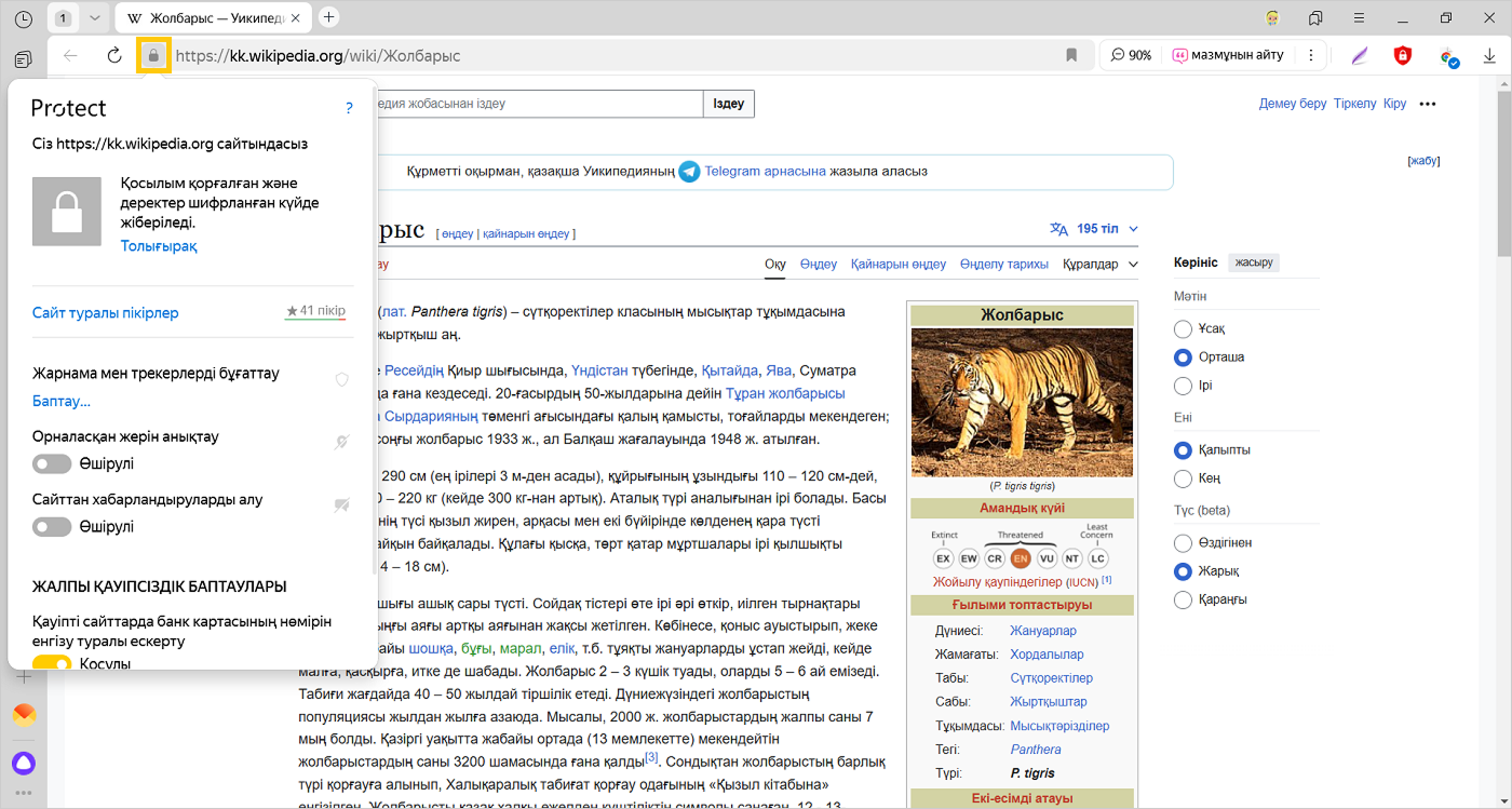 Қауіпсіздік белгішелері беттің мекен-жайының оң және сол жағындағы Ақылды жолда көрсетіледі. Protect жолағын ашу үшін белгішені басыңыз. Тақтада қауіпсіздік туралы толық ақпаратты көріп, соған байланысты баптауларды өзгерте аласыз.