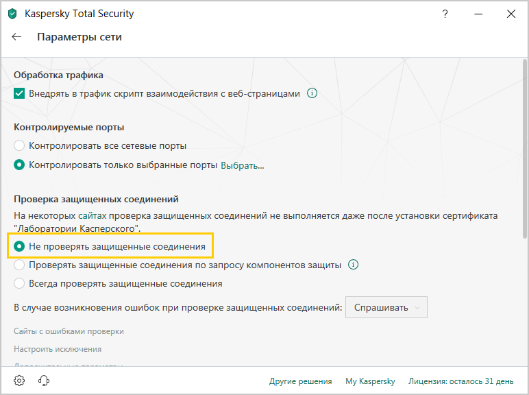 HTTPS тексеруден бас тартыңыз (Веб-хаттамалар бөліміндегі HTTPS хаттамасын тексеруді қосу опциясы).