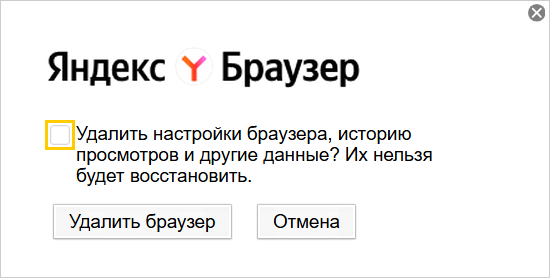 7. Нажмите Удалить браузер, оставив неактивной опцию Удалить настройки браузера, историю просмотров и другие данные.