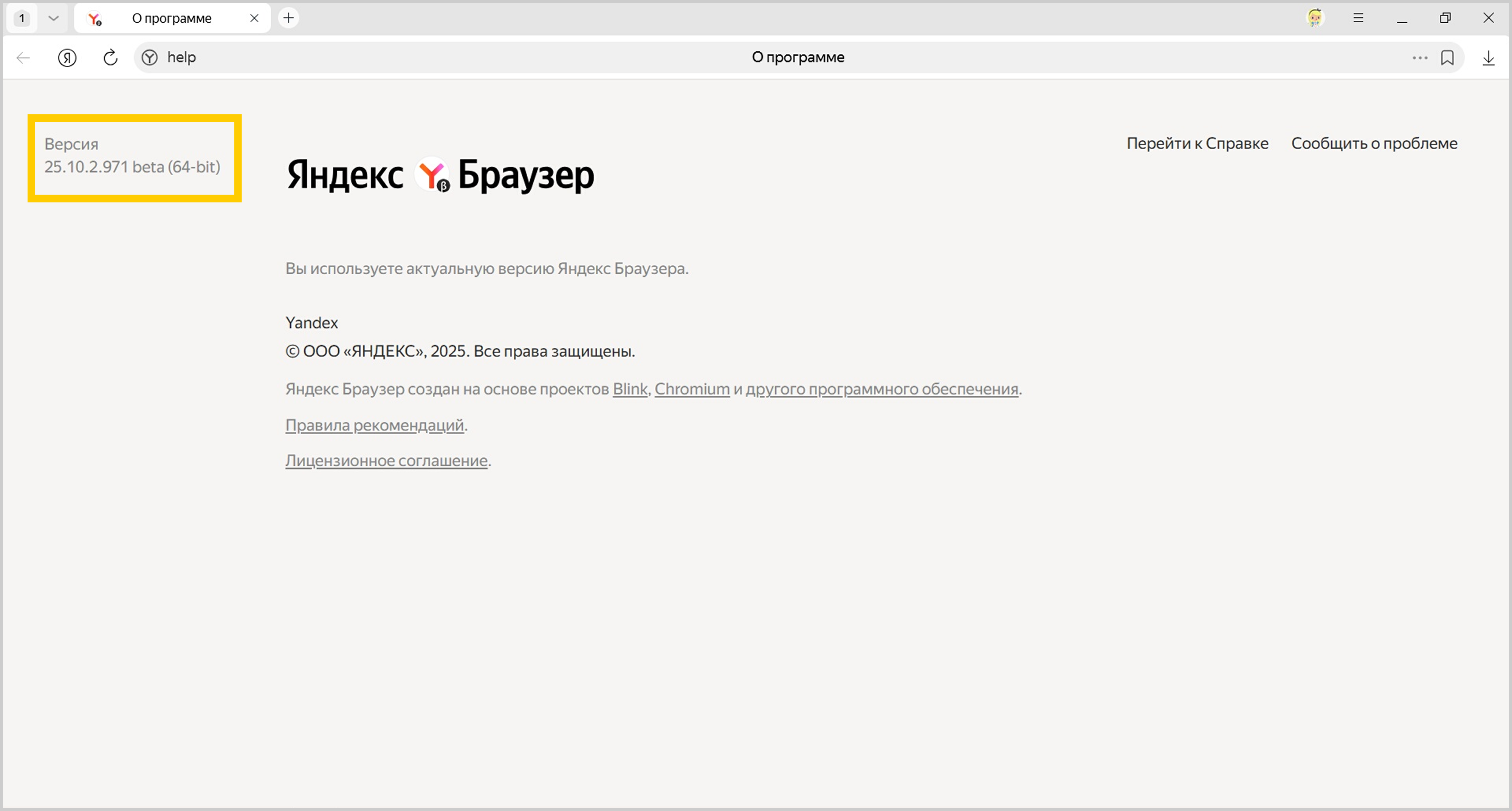 Чтобы узнать версию Браузера, нажмите Настройки Яндекс Браузера → Помощь → О Браузере или наберите в Умной строке адрес browser://help