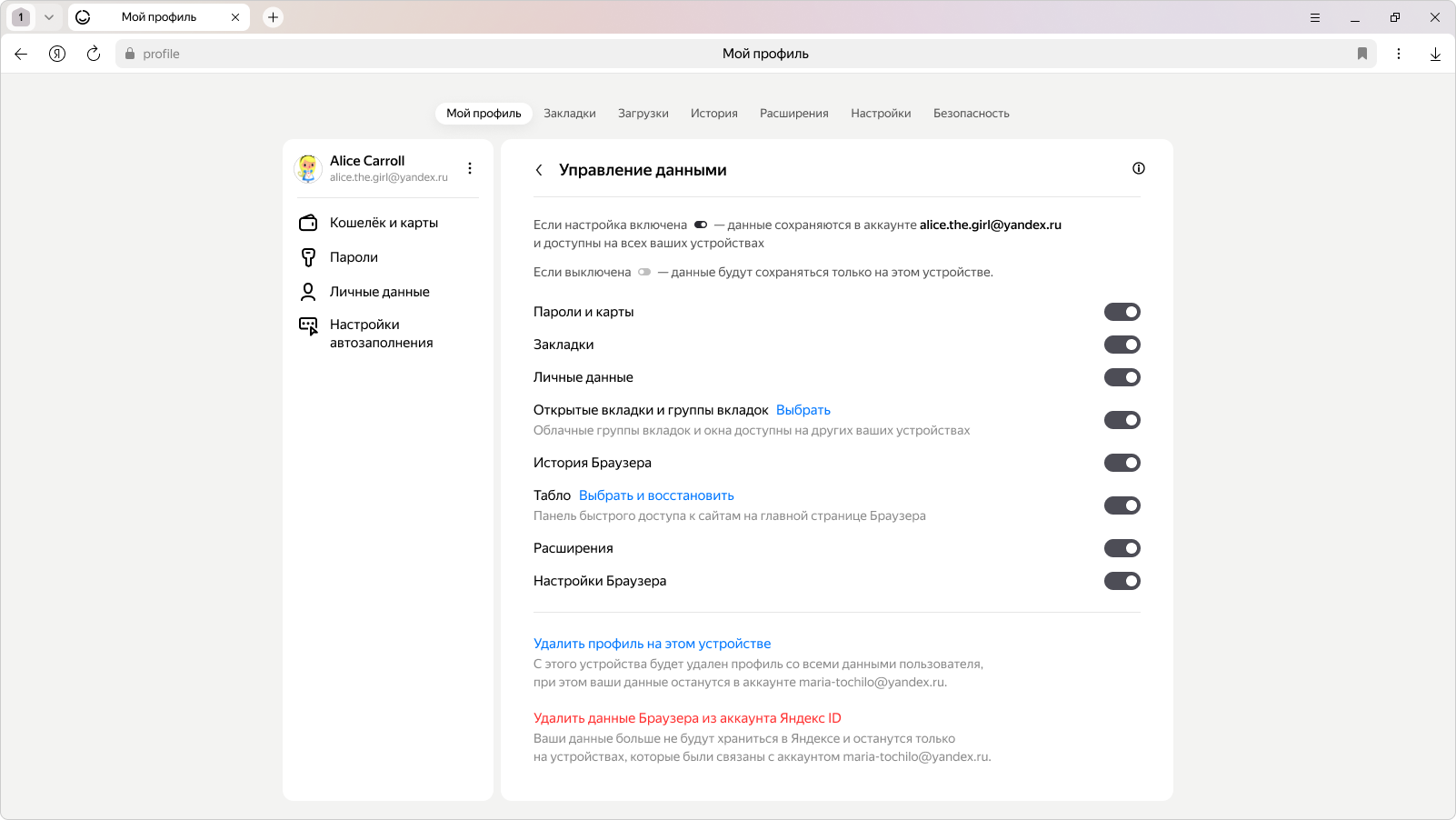 В окне Мой профиль нажмите Управление данными.