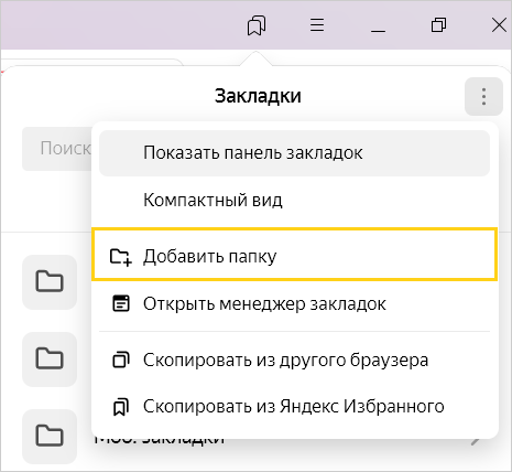 Справа от Закладки нажмите → Добавить папку.