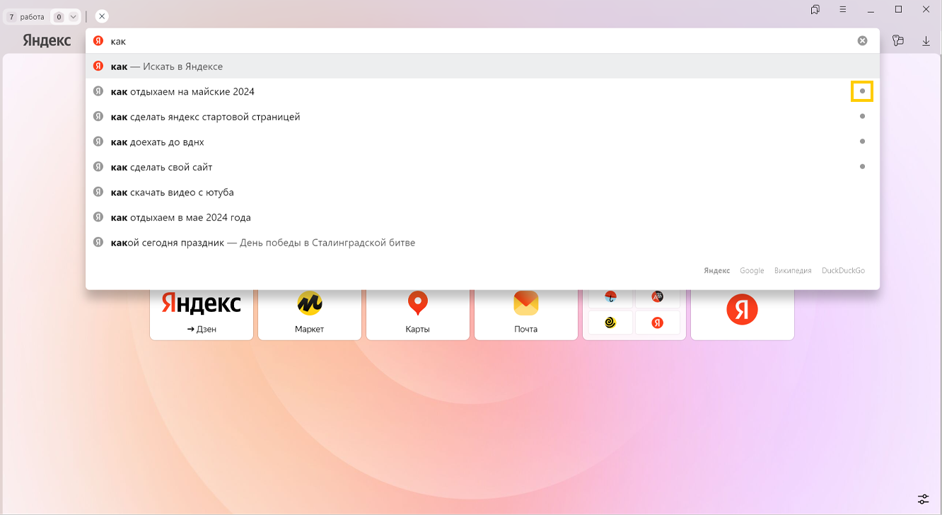 Чтобы удалить сохраненный в Браузере запрос, наведите на него указатель и нажмите . Если вы хотите удалить все запросы, очистите историю просмотров.
