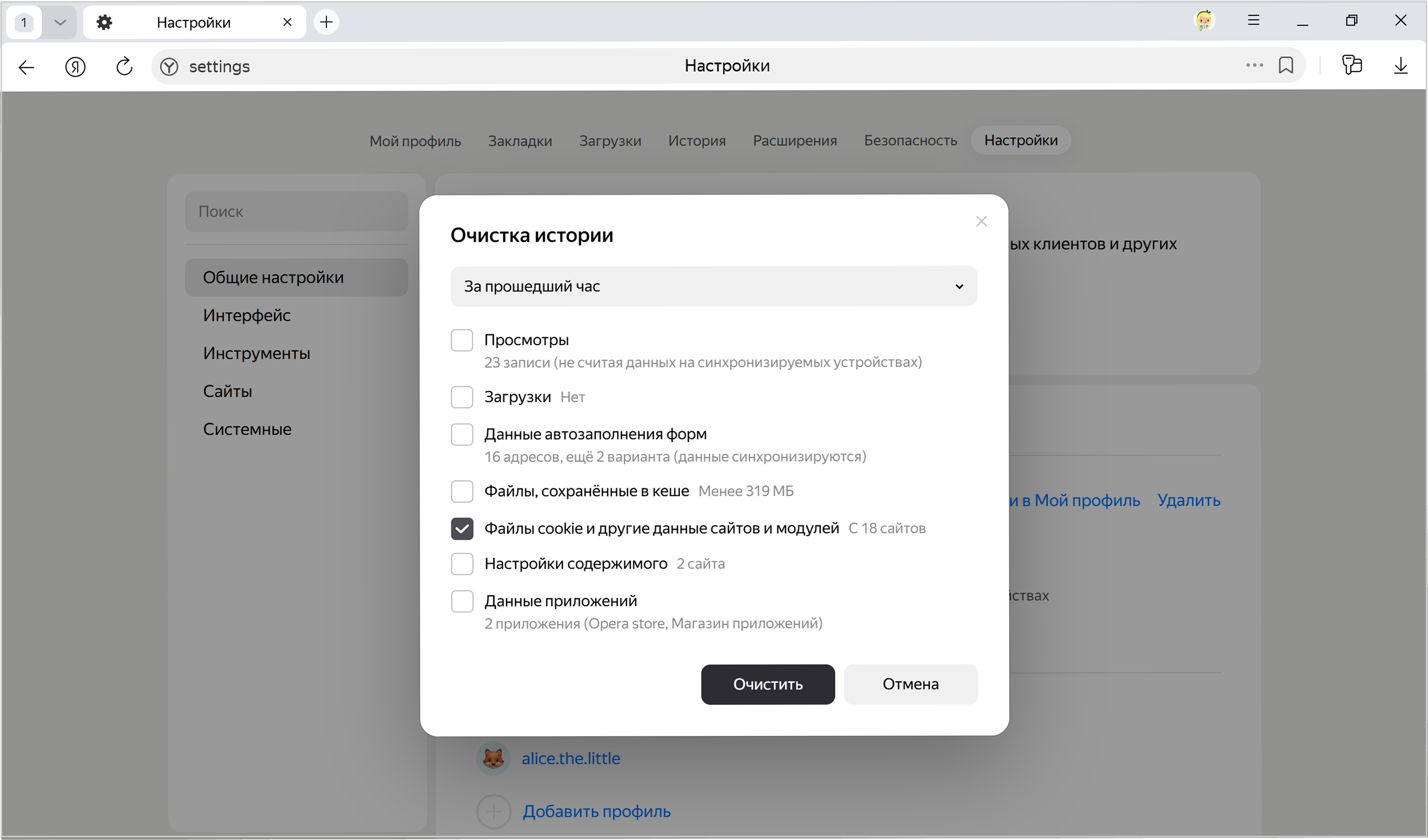 Выберите пункт Файлы cookie и другие данные сайтов и модулей (отключите остальные опции, если хотите удалить только cookie).