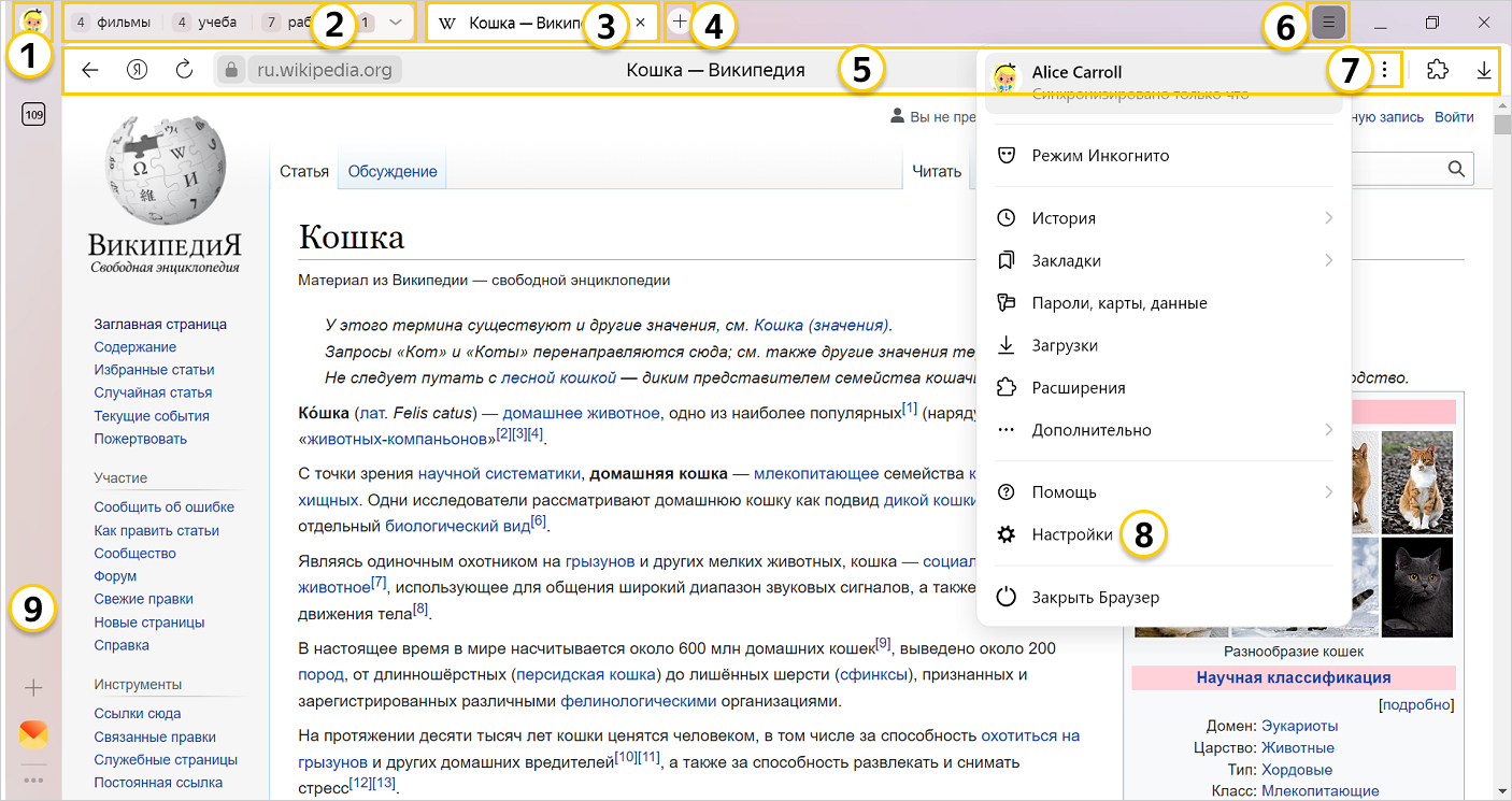 Интерфейс Браузера включает множество элементов. Их можно включать и отключать, настраивая Браузер под свои потребности.