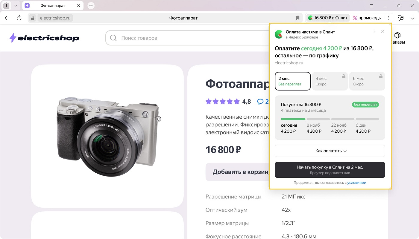 Можно не оплачивать весь заказ целиком, а растянуть оплату на два месяца с помощью Сплита в Яндекс Браузере. Первый платеж спишется сразу, остальные — по фиксированному графику. Подробнее о Сплите — в Справке.