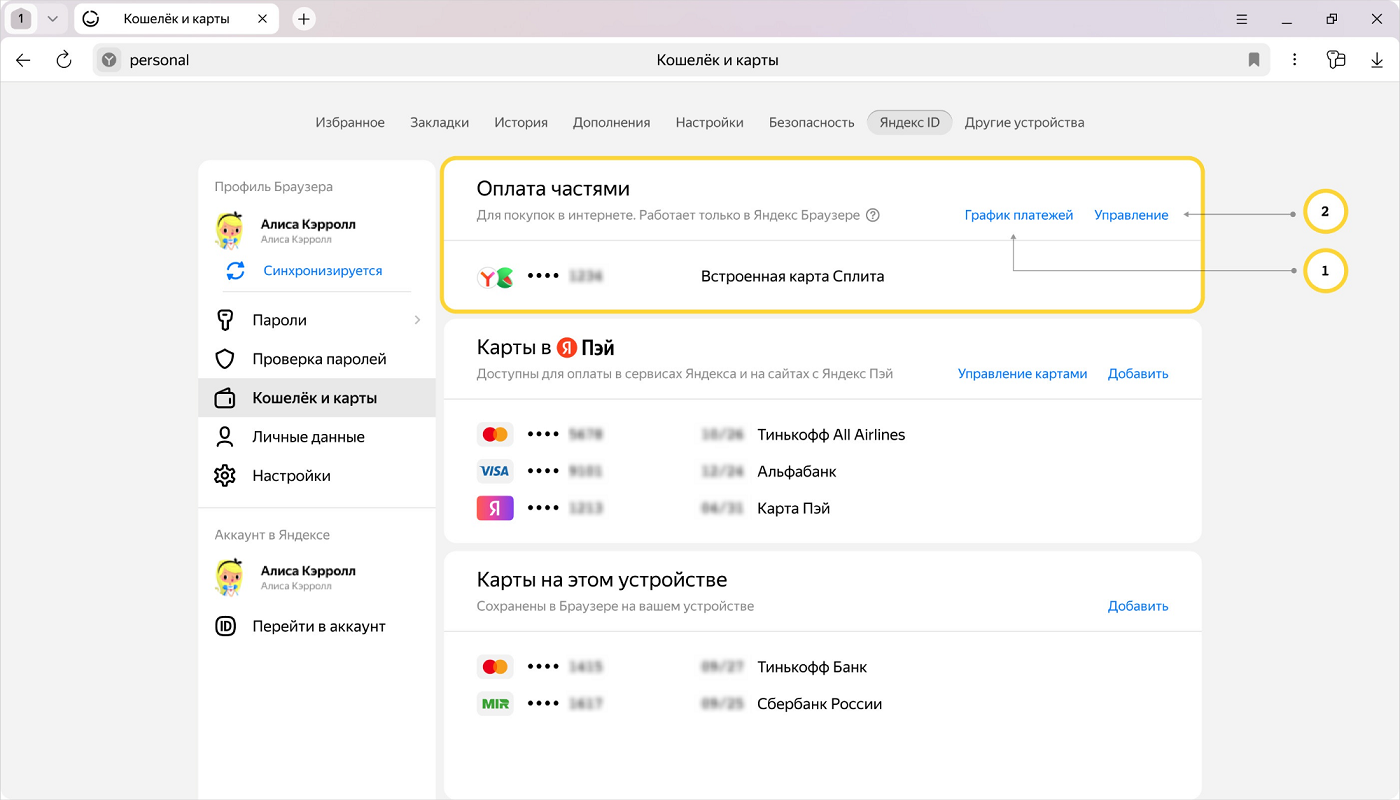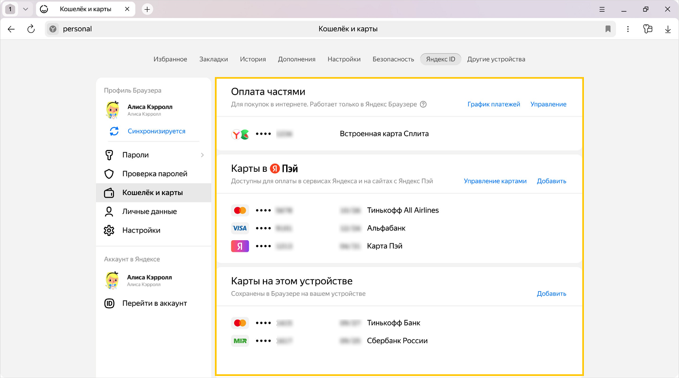 Браузер подставляет данные этих карт в платежные формы на сайтах, когда вы совершаете покупки. Вы можете управлять списком, чтобы оставить только нужные карты.