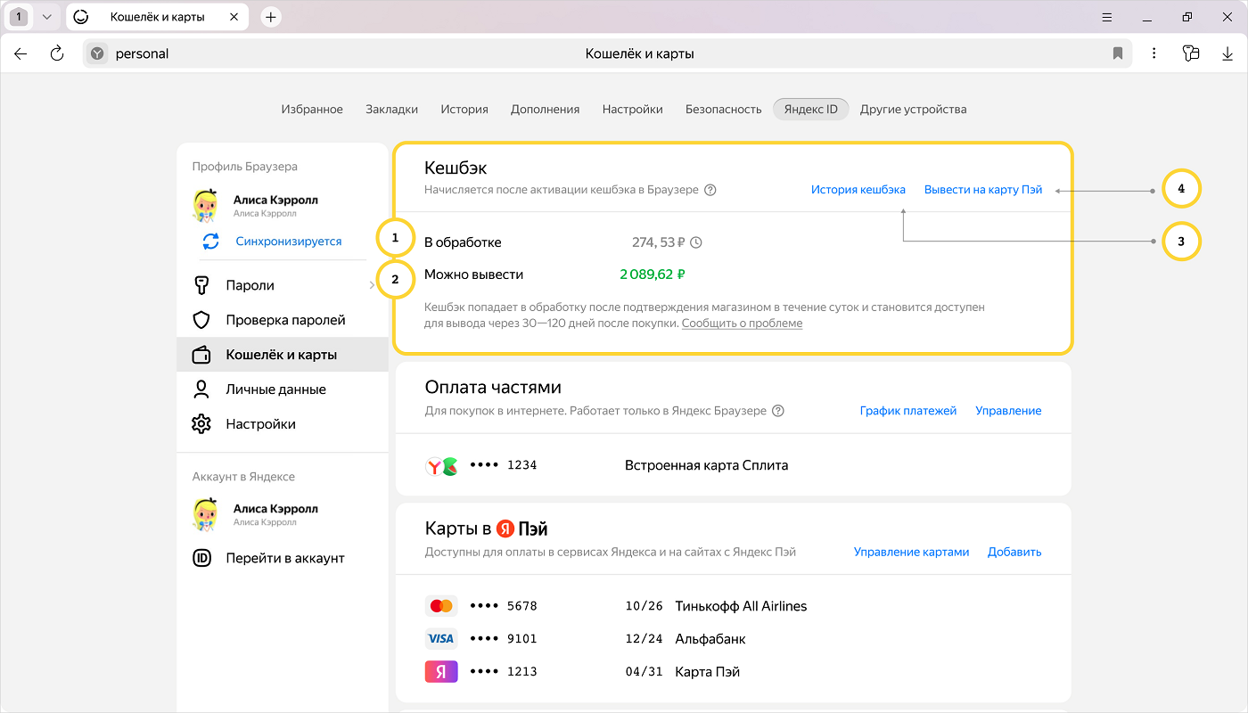 В разделе Кешбэк отображается сумма вашего кешбэка за покупки через Браузер.