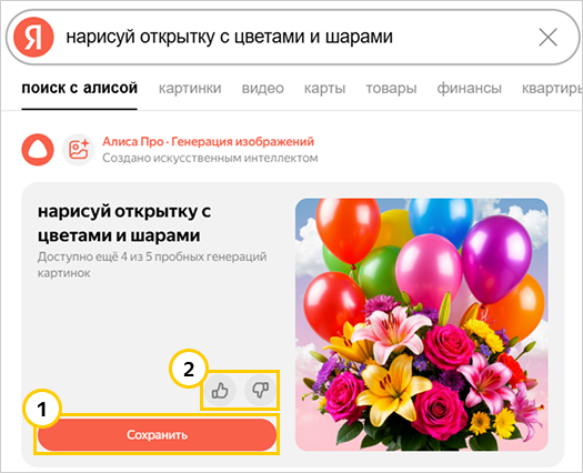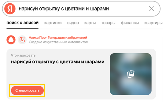 нарисуй открытку. Чем подробнее будет описание, тем релевантнее будет изображение. Например, не простонарисуй открытку, анарисуй открытку с цветами и шарами. - Нажмите Сгенерировать. Алиса создаст картинку в течение минуты.