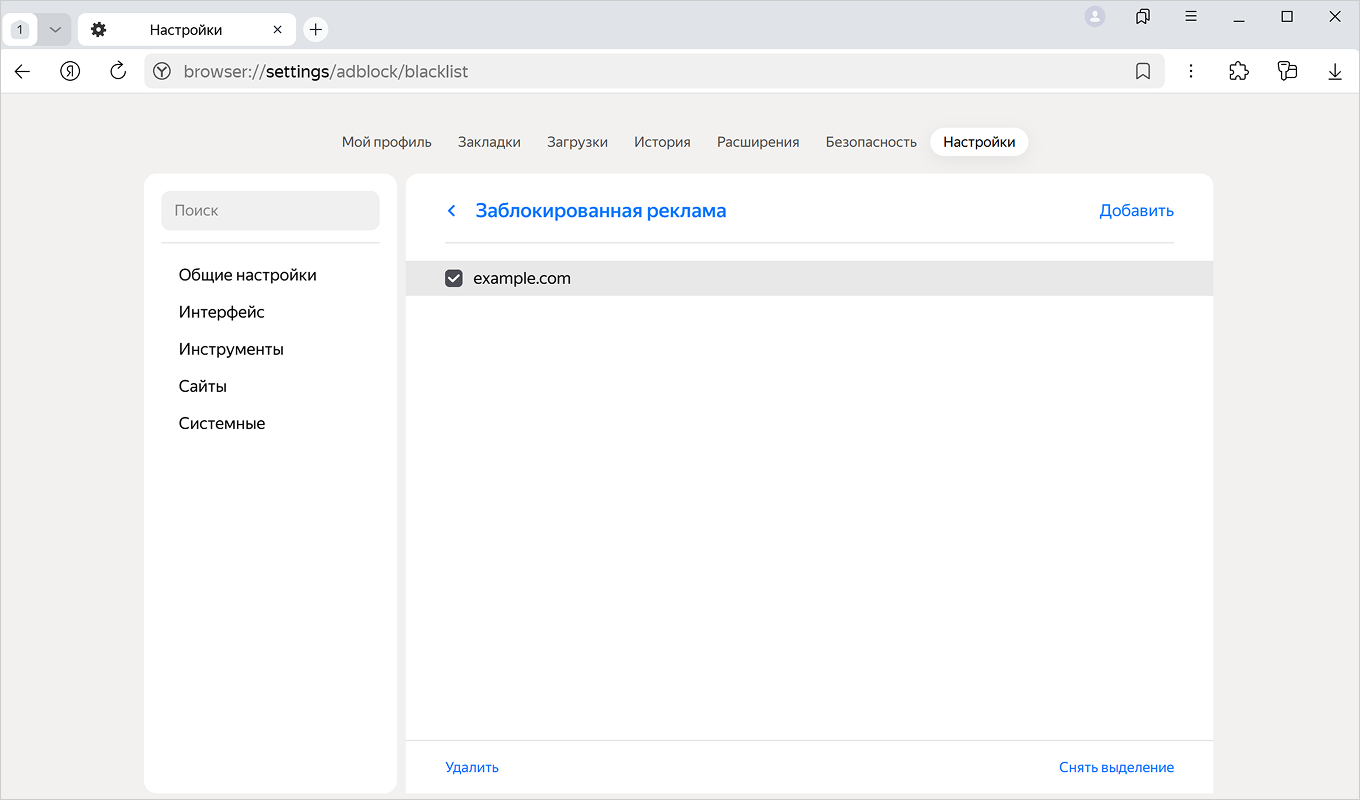 В разделе Блокировка рекламы нажмите Список сайтов-исключений.