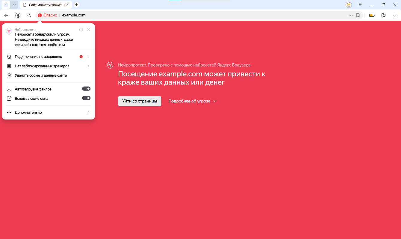 При вводе номера платежной карты Браузер может вывести на экран предупреждение, что присутствует явная угроза кражи данных или проблема с безопасностью. В этом случае в Умной строке появляется значок Опасный сайт и открывается окно с предупреждением.