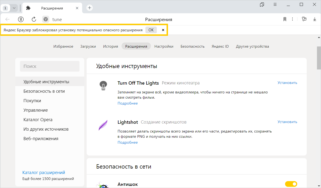 Прежде чем установить расширение, Браузер сравнивает его со списком вредоносных расширений, хранящихся в специальной базе данных. Если расширение есть в списке, Браузер блокирует его установку и сообщает об этом: