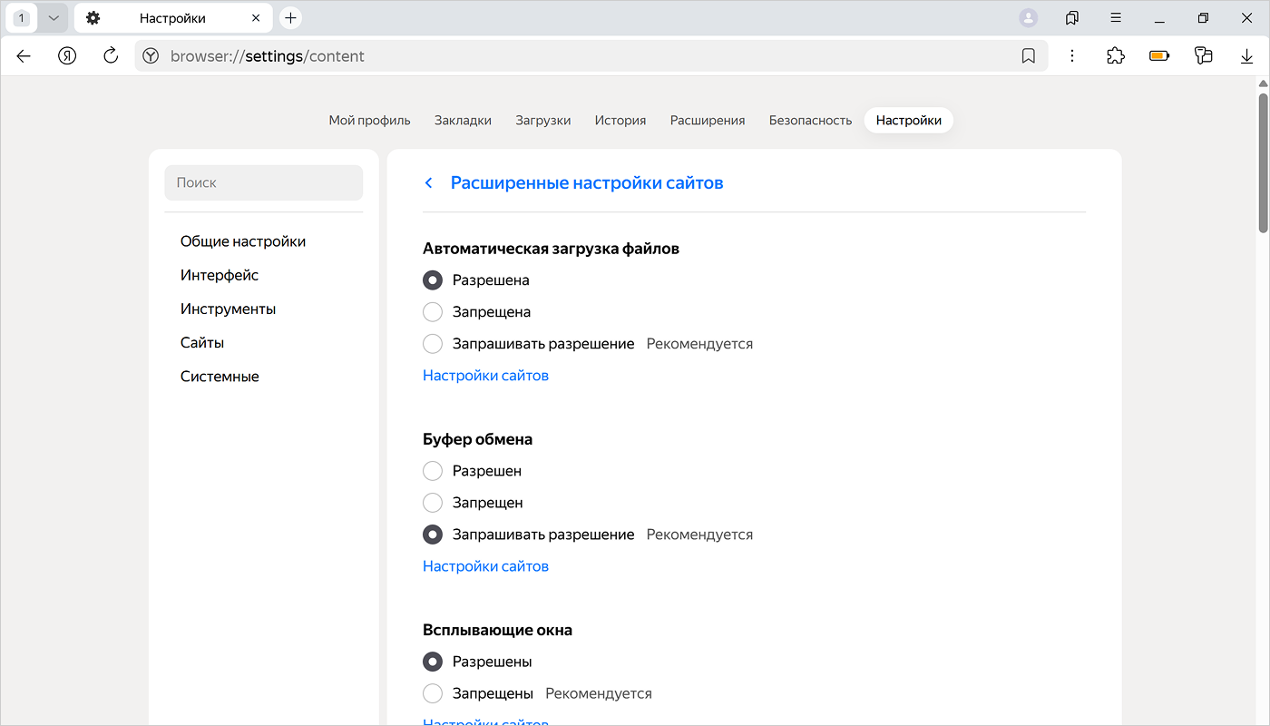 Нажмите → Настройки → Сайты.