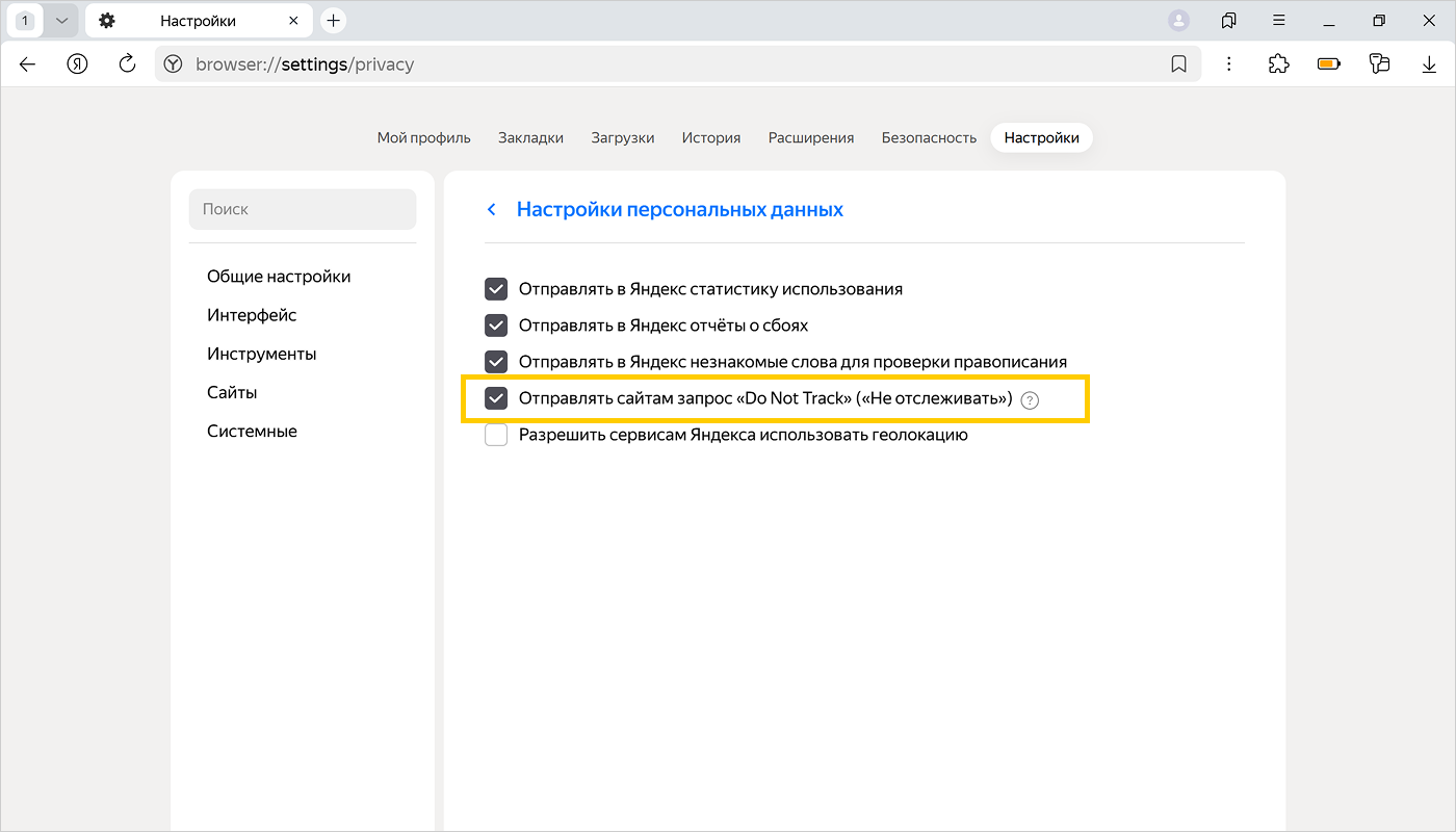 Включите опцию Отправлять сайтам запрос «Do Not Track» («Не отслеживать»).