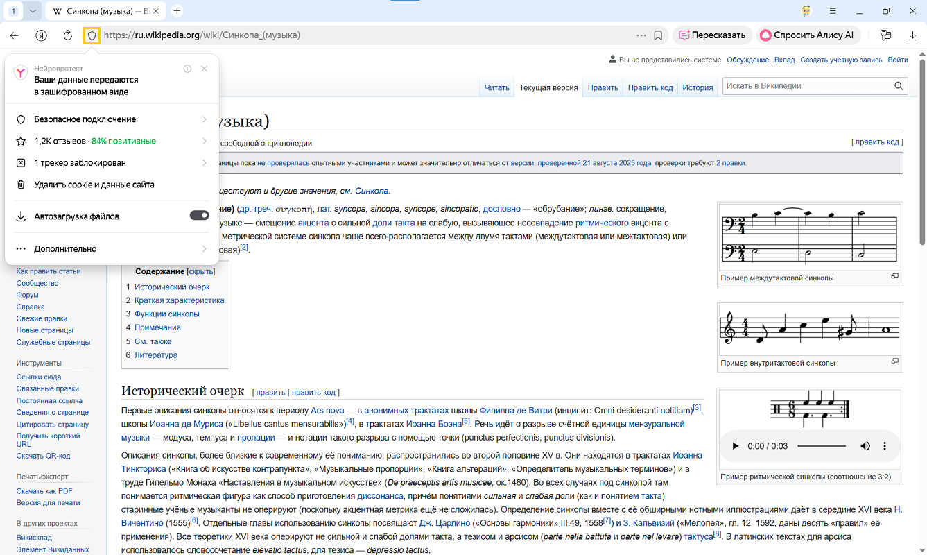 Значки безопасности отображаются в Умной строке слева от адреса страницы. Нажмите значок, чтобы открыть панель Нейропротект. Там вы увидите подробности о безопасности и сможете изменить связанные с ней настройки.