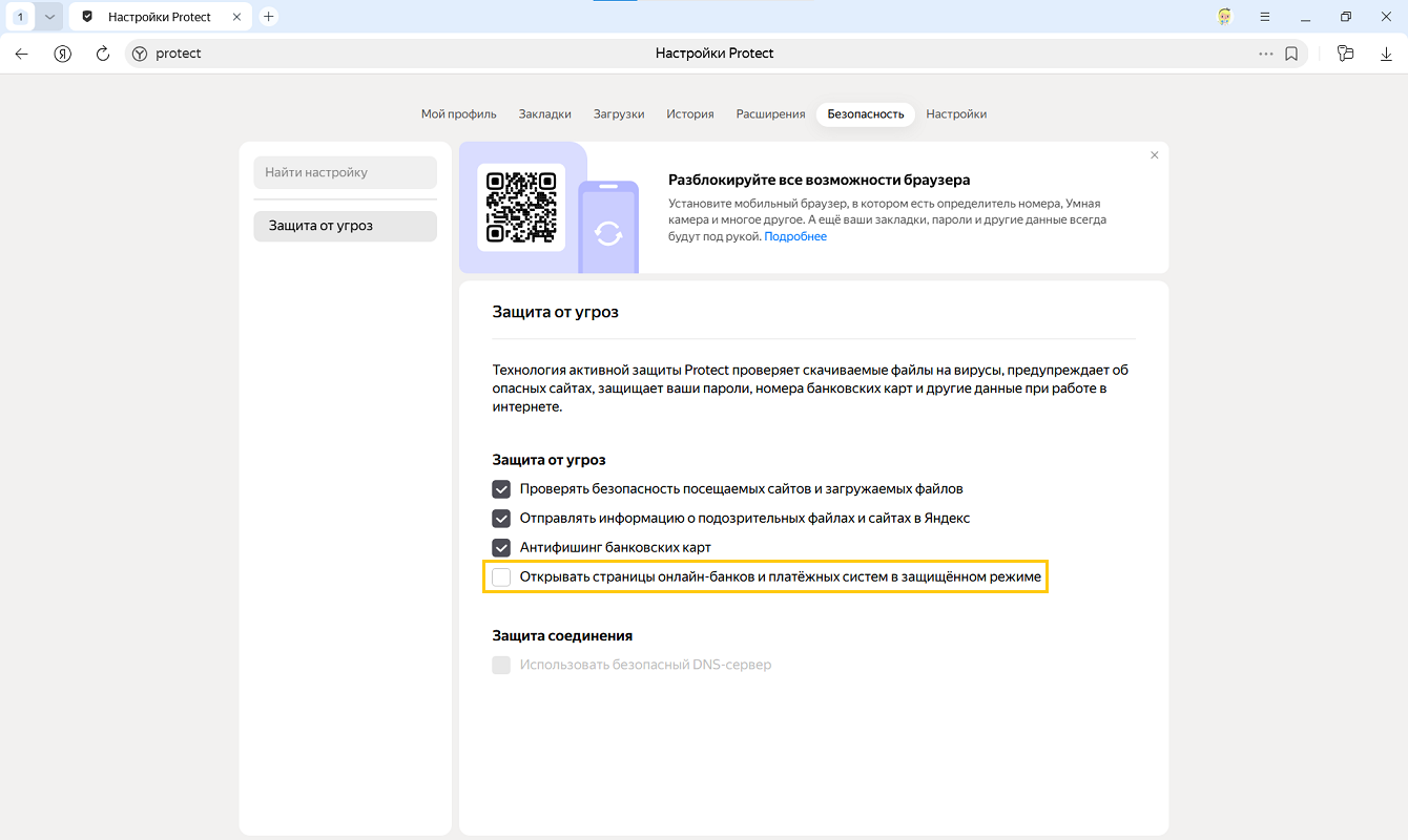 В разделе Защита от угроз отключите опцию Открывать страницы онлайн-банков и платёжных систем в защищённом режиме.
