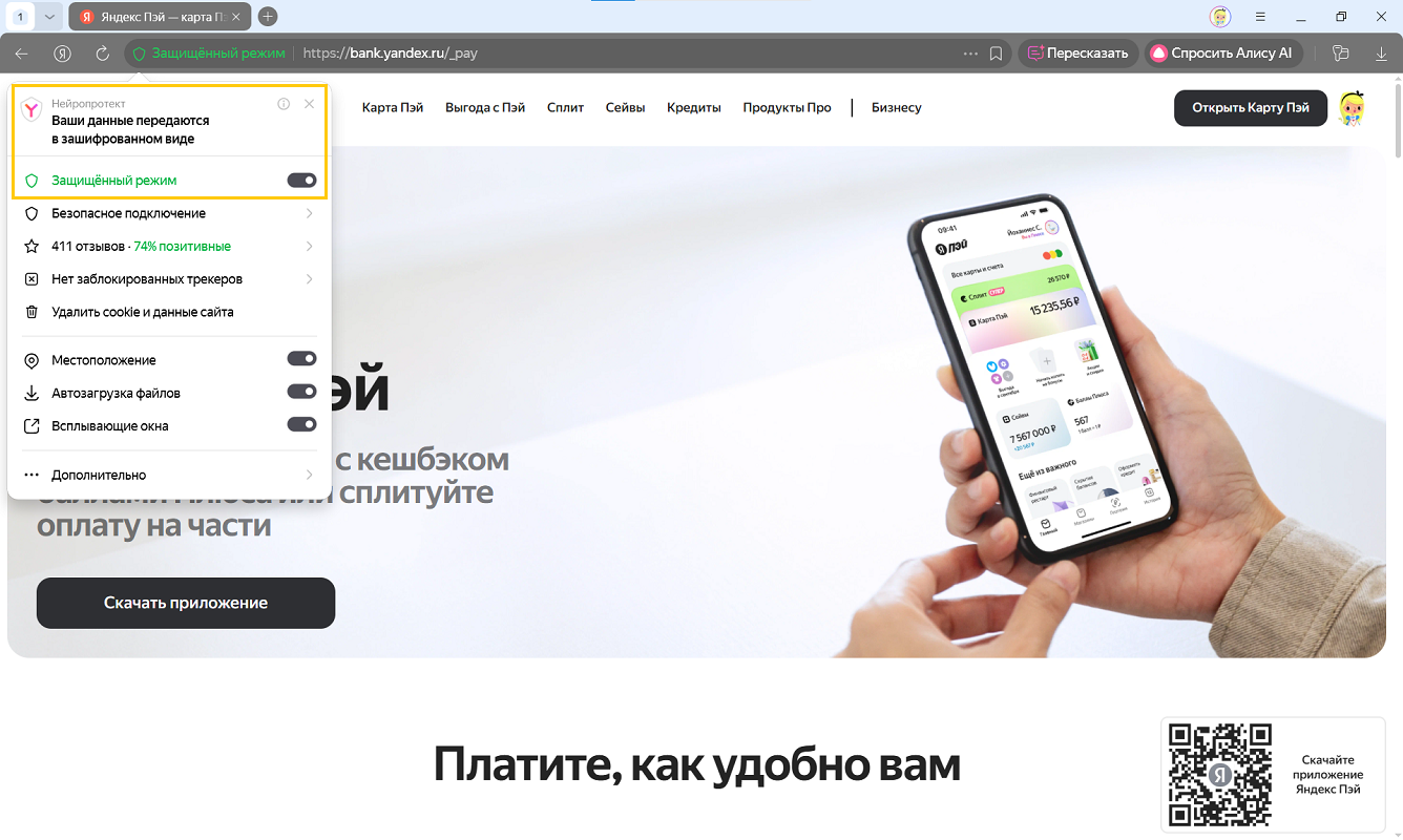 Если вы открыли страницу онлайн-платежа и не видите изменений интерфейса, включите защищенный режим принудительно.