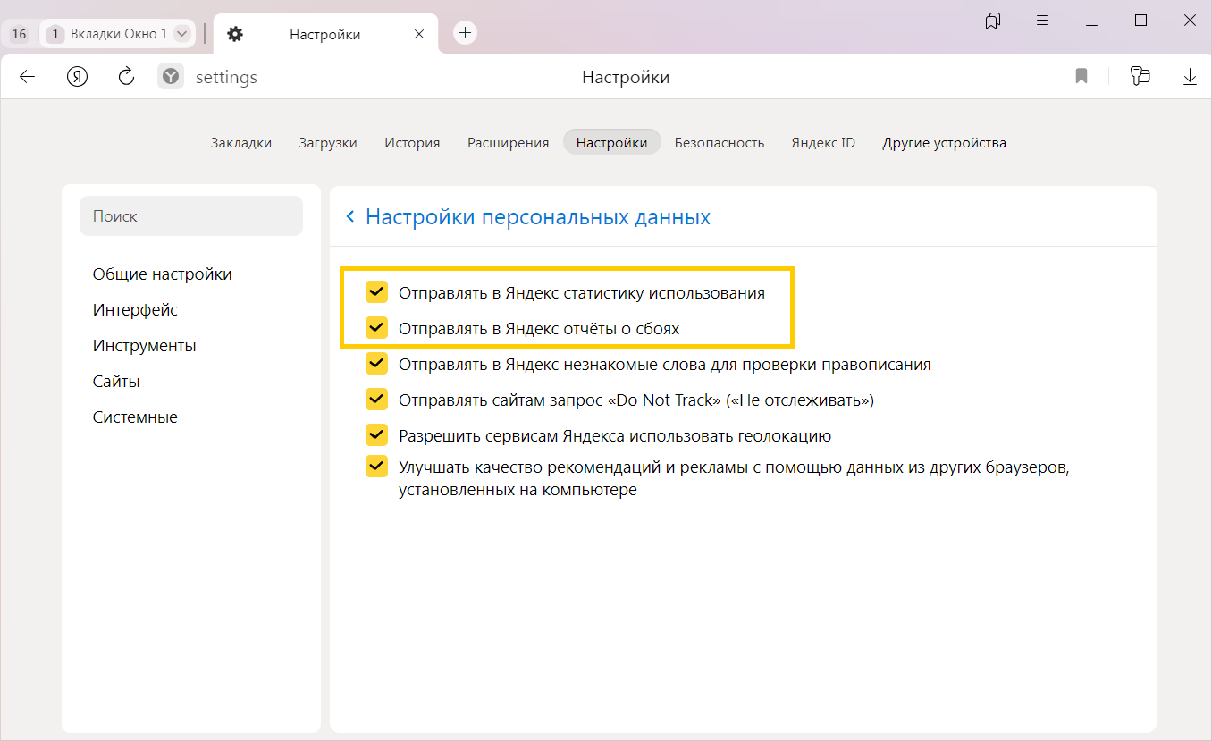 Мы постоянно улучшаем Браузер и другие сервисы Яндекса. Если хотите помочь нам в этом — разрешите Браузеру отправлять в Яндекс статистику использования и отчеты о сбоях: