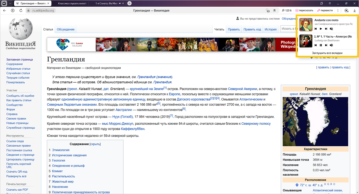 • чтобы заглушить музыку, на вкладке нажмите значок  ;