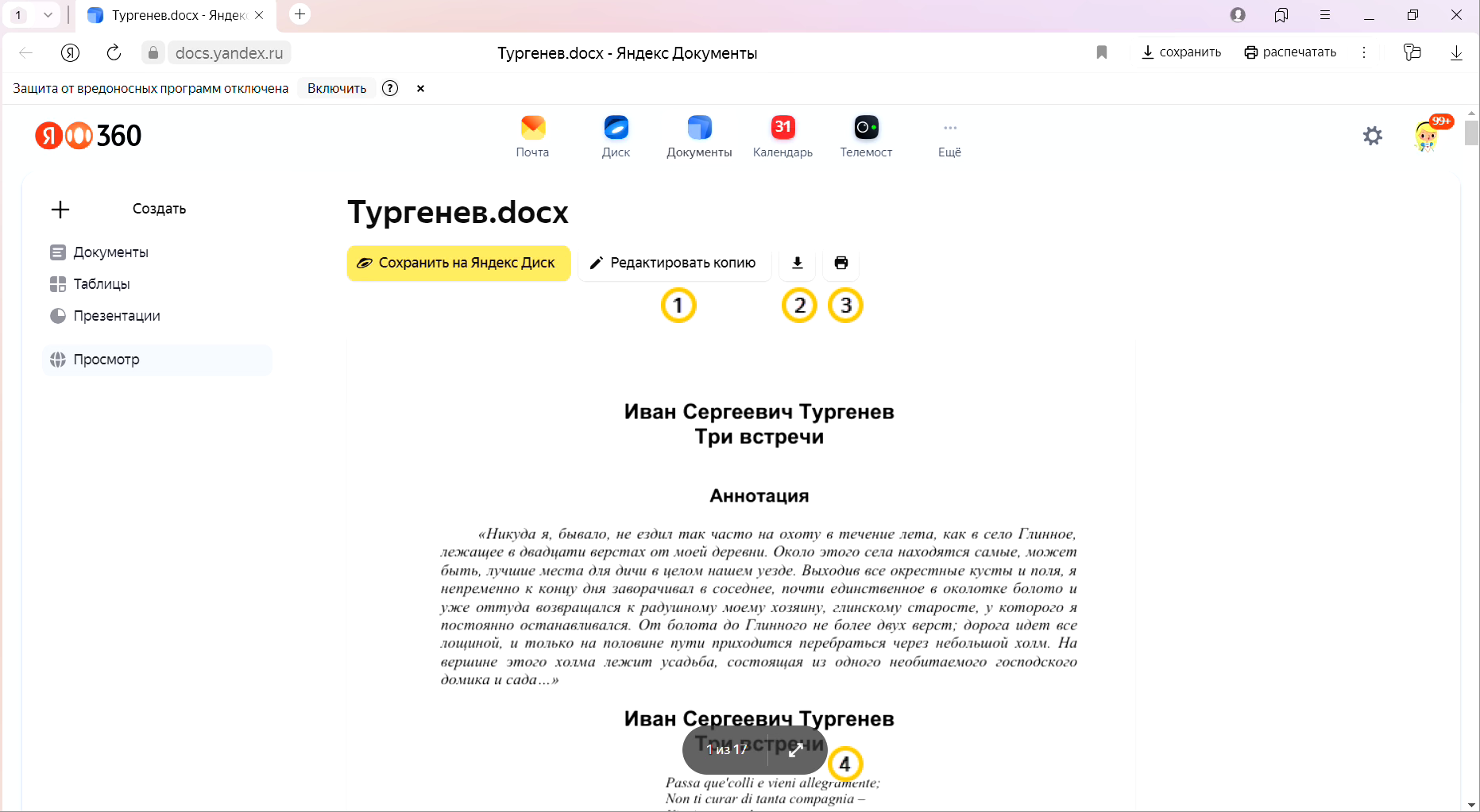 Документы, таблицы и презентации, открытые в Браузере, можно редактировать с помощью Яндекс Документов. Для этого нажмите в верхней части документа кнопку Редактировать копию. Копия документа сохранится на Яндекс Диск в папку Загрузки. Также вы можете редактировать документы онлайн совместно с друзьями или коллегами. Подробнее см. в Справке Яндекс Документов.