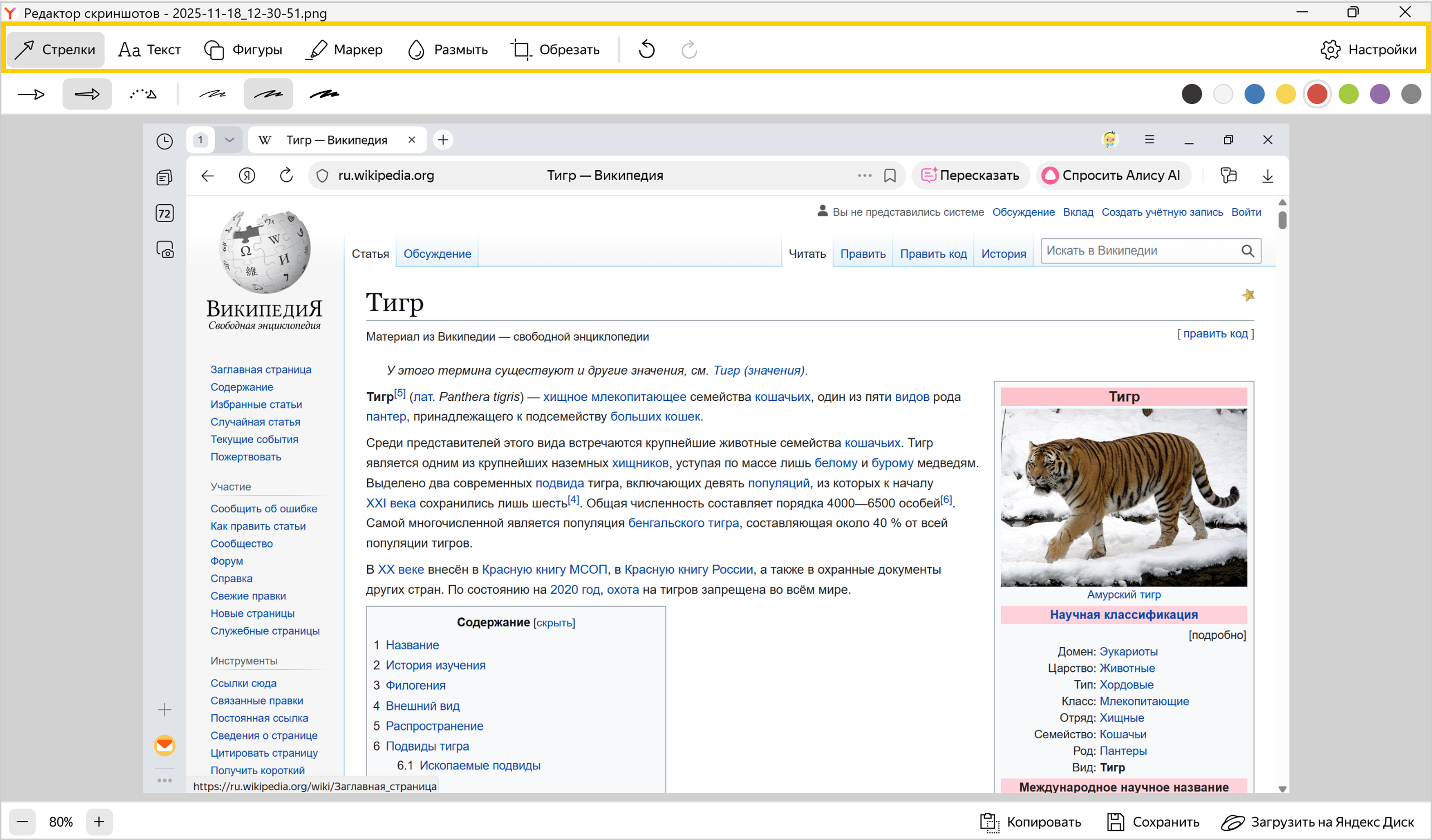 Вы можете обрезать сделанный скриншот, нарисовать на нем фигуры или стрелки, пометить маркером, добавить текстовые надписи, размыть часть изображения.