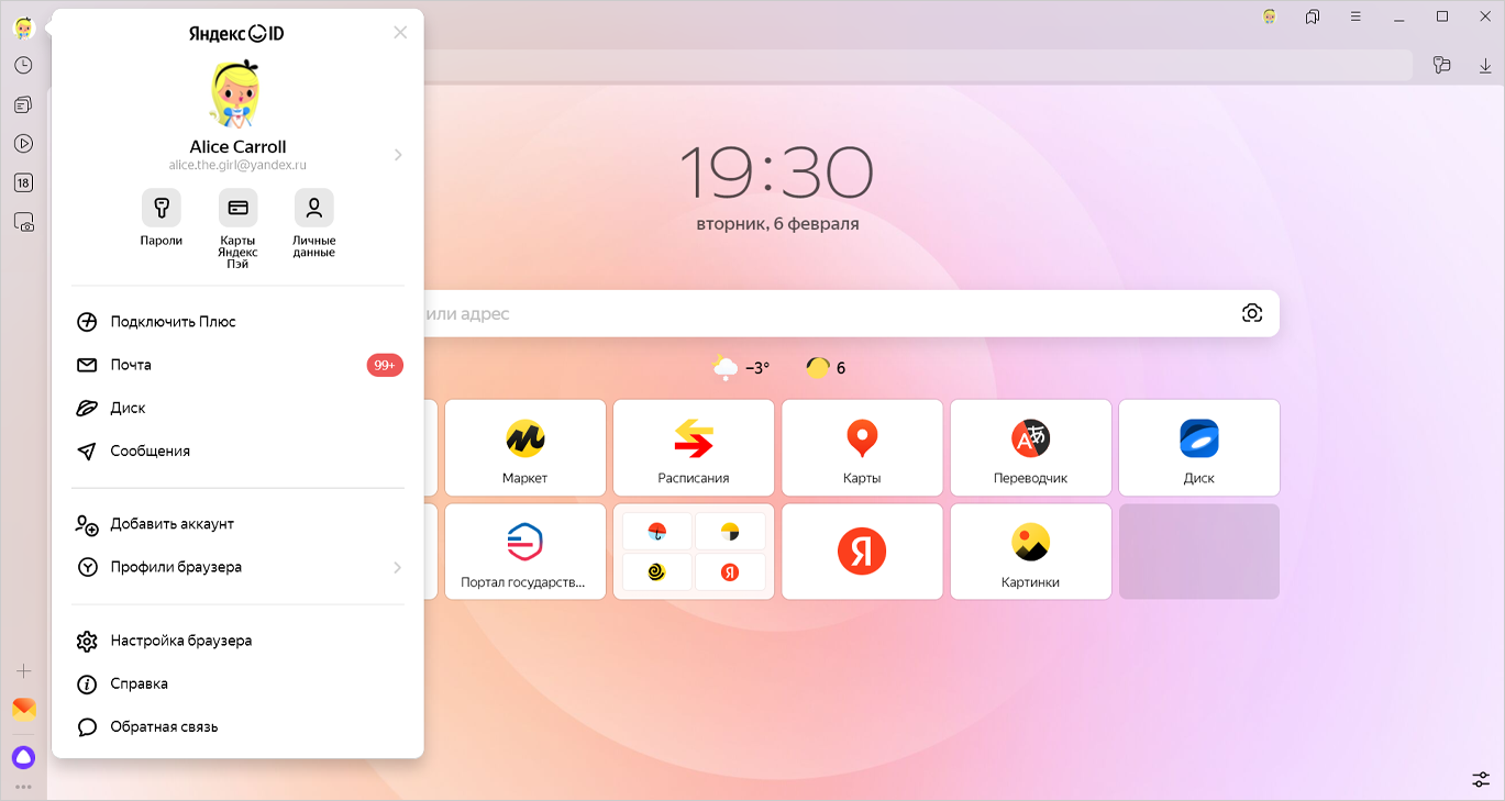 Giriş yaptıktan sonra kişisel verilere (ör. şifreler, haritalar), Yandex servislerine ve Yandex Browser’ın sık kullanılan işlevlerine hızlı erişim sağlanır.