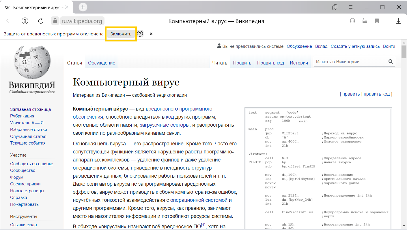 Bu nedenle, kötü amaçlı yazılımlara karşı koruma devre dışı bırakılmışsa, Yandex Browser bu konuda uyarıda bulunur ve korumanın etkinleştirilmesini önerir: