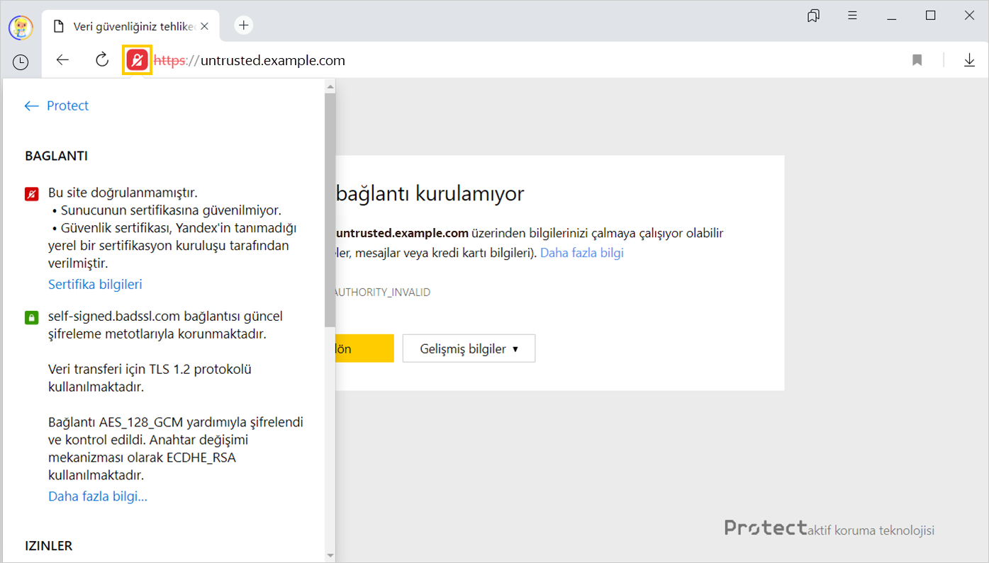 Şu bildirimi görürsünüz: "example.com sitesine geçiş yapmayı denediniz. Bu sitenin güvenlik sertifikası güvenilir değildir. İşletim sisteminiz bu sertifikayı güvenilir olarak kabul ediyor ancak bu sertifikayı sağlayan sertifikasyon kuruluşu Yandex tarafından bilinmemektedir...".