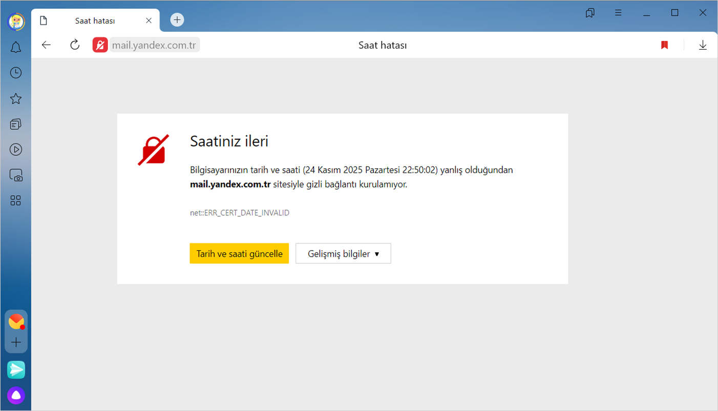 Öte yandan, bilgisayarınızın saati yanlış ayarlıysa Yandex Browser ilgili sitenin sertifikasının geçerli olup olmadığını belirleyemez. Bu nedenle siteyi açtığınızda, saatinizin ileri olduğuna veya geri kaldığına dair bir mesaj görürsünüz.