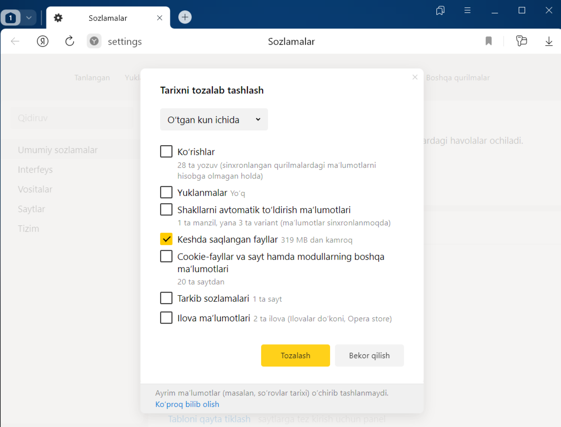 Tarixni tozalashro‘yxatida keshni tozalash uchun davrni tanlang.