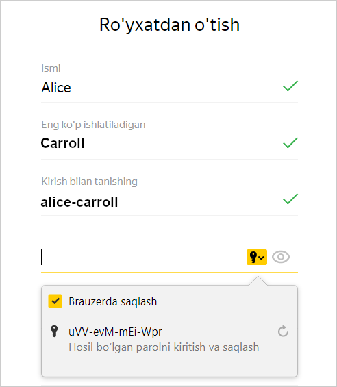 1. Sichqoncha kursorini parolni kiritish katagiga o‘rnating. Brauzer avtomatik ravishda yaratilgan parolni taklif qiladi.