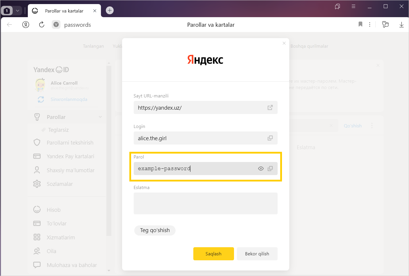 Xavfsizlik uchun parollar serverda shifrlangan shaklda saqlanadi. Shuning uchun hatto Yandex ham parollaringizni shifrdan chiqara olmaydi.