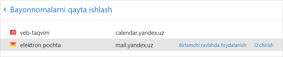 (Yandex Brauzer beta versiyasi) sozlamalarida elektron pochta va taqvim uchun sukut bo‘yicha ishlatiladigan veb-xizmatni berish mumkin.