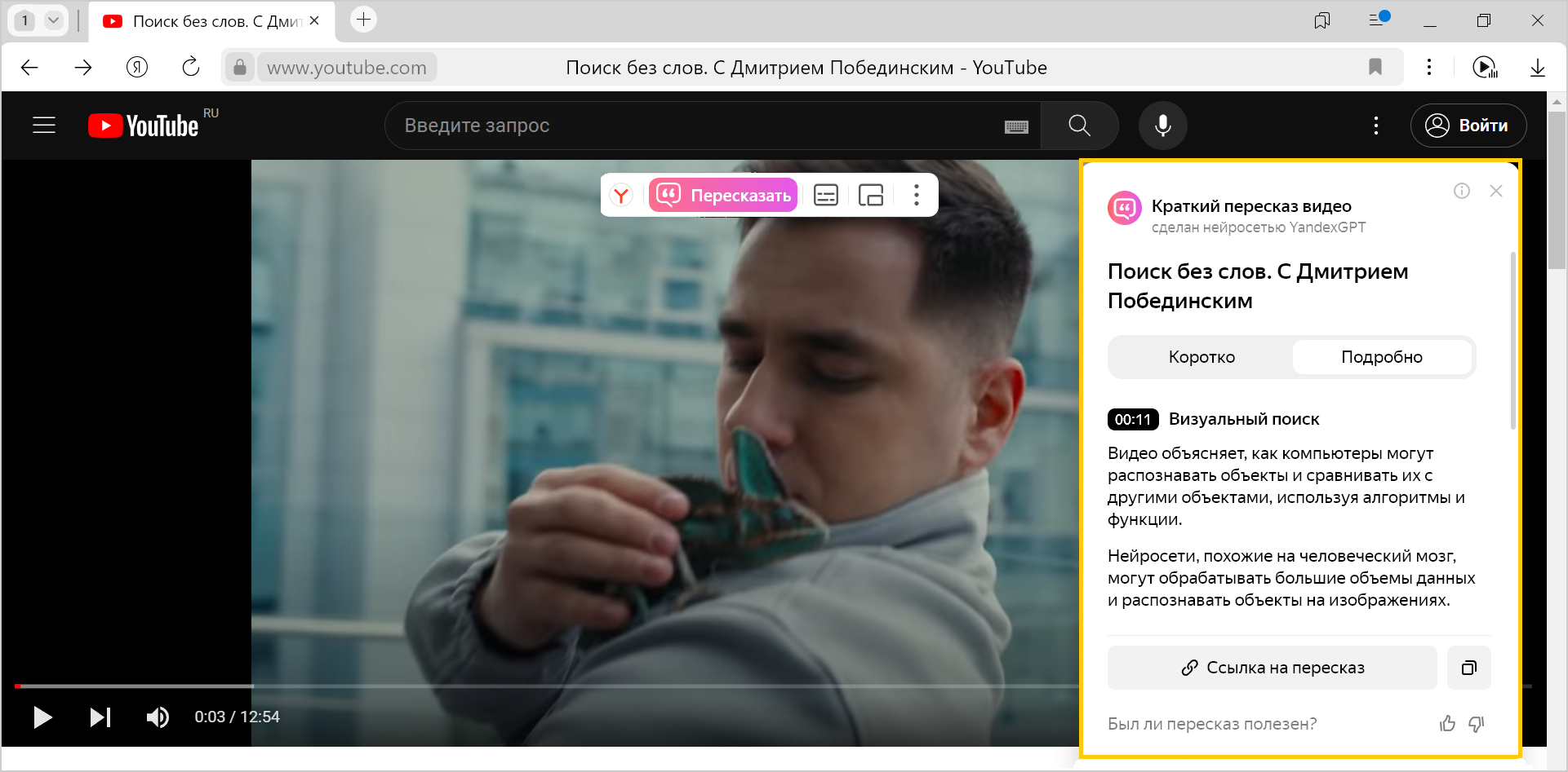 The YandexGPT neural network can summarize videos and show timestamps so you can quickly navigate to the interesting part. Yandex Browser can summarize videos in Russian, English, French, German, Spanish, Italian, Chinese, Japanese, and Korean. The summary itself is generated in Russian.