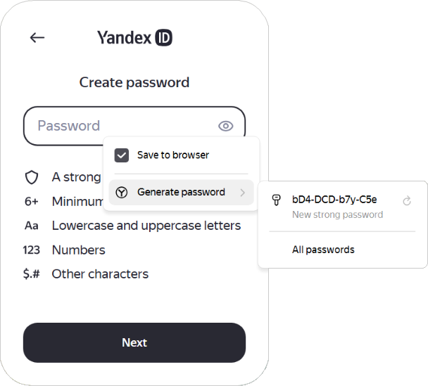 1. Place the cursor in the password field. Yandex Browser will automatically generate a password for you.
