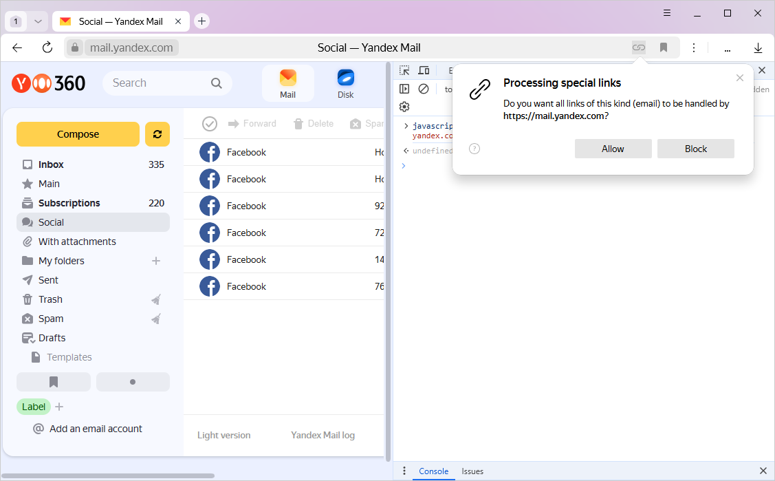 When you open Yandex Mail in Yandex Browser for the first time, it offers to make it your default protocol handler:
