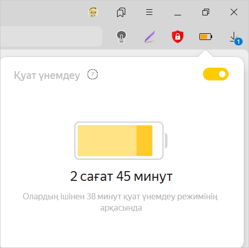Энергия үнемдеу режимі Яндекс Браузерде батарея қуатын үнемдейді. Ол сізге электр желісінен ажыратылған ноутбукта бір сағатқа ұзағырақ жұмыс істеуге мүмкіндік береді.