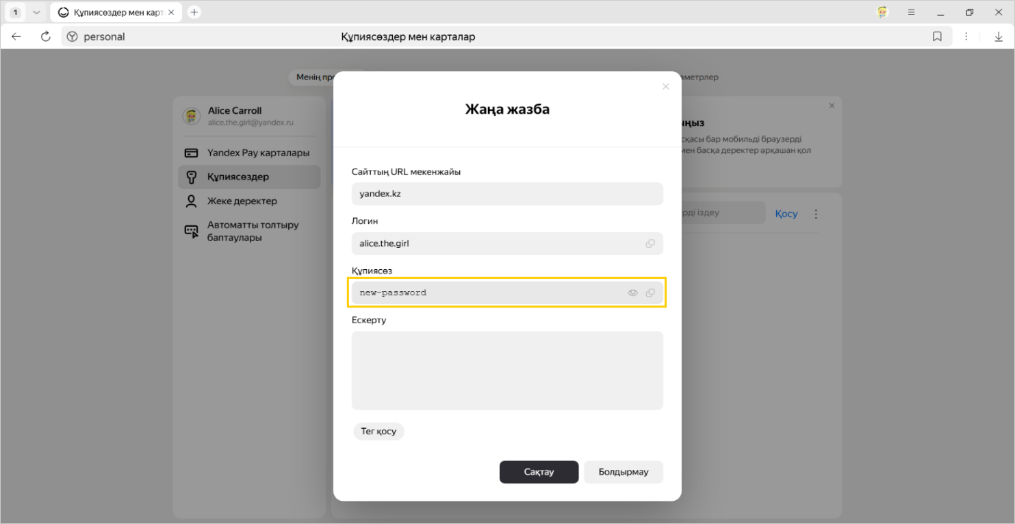 Сол сияқты, сіз құпиясөздер менеджерінде, төлқұжат нөмірі және басқа да құпия ақпаратты сақтауға болады. Егер сізде карталарды сақтау қосылған болса, онда деректер сіздің бүкіл құрылғыңыздан қолжетімді болады. Деректер қауіпсіздігі үшін алаңдамауға болады — олар шифрланған түрде сақталады.